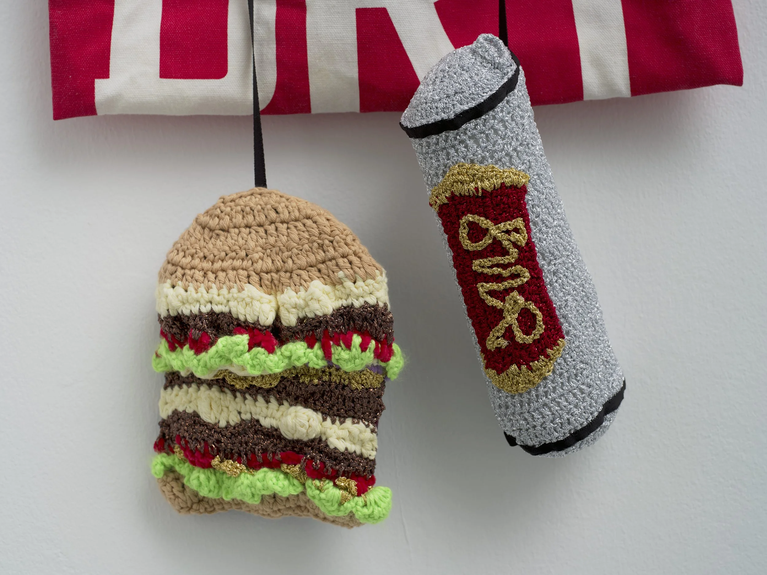Richardson presents a menu of enticing and handy takeaway bags crammed with ultra-processed goodies ranging from hamburgers and sausage rolls, noodles and baltis, to psychedelic doughnuts and cute-as-pie cupcakes, rendered in bright cotton and metallic yarns. The works are a characteristically sly invitation to a bit of what you fancy, but with lists of ingredients to make you question your choices. Playfully, they point to a desolation behind empty calories and abundance, to the real trade-offs at play when fresh and unprocessed foods weigh more heavily on the wallet than their oven-ready alternatives.