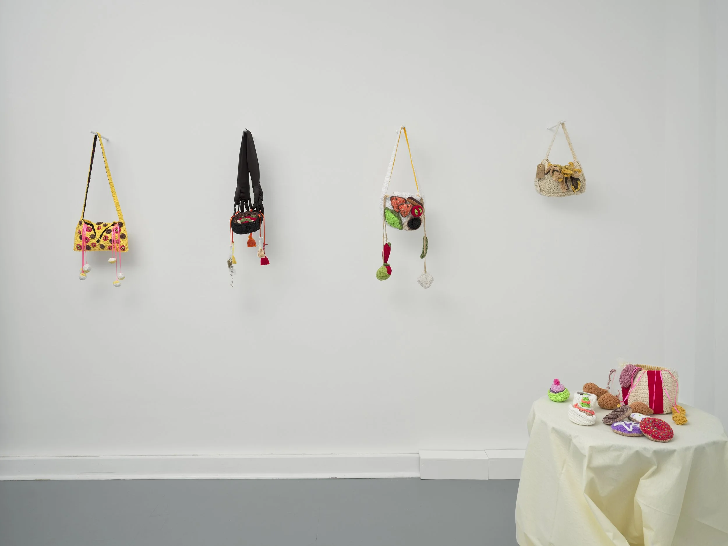 Celebrated for her mordant and funny use of crochet to address feminist issues, It’s In the Bag focuses on nutrition and the economics of home-making in an era where convenience foods and delivery apps have boomed to meet the needs of a time-poor labour force in search of comfort and ease… but at what cost? In light of recent discoveries in metabolic health and the microbiome popularised by the likes of Chris van Tulleken and Tim Spektor, the challenges of balancing work with home life have brought new dimensions of complexity into the already vexed question of what to have for dinner.